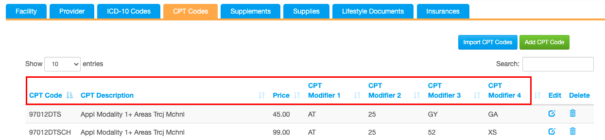 2. Once you add/edit/update CPT codes, you will be able to see them in the CPT master list like this.