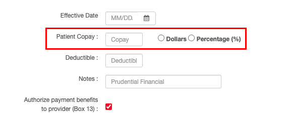 8. If the patient’s insurance card shows copay details, select either Dollars or Percentage and then enter the Copay amount in the box.