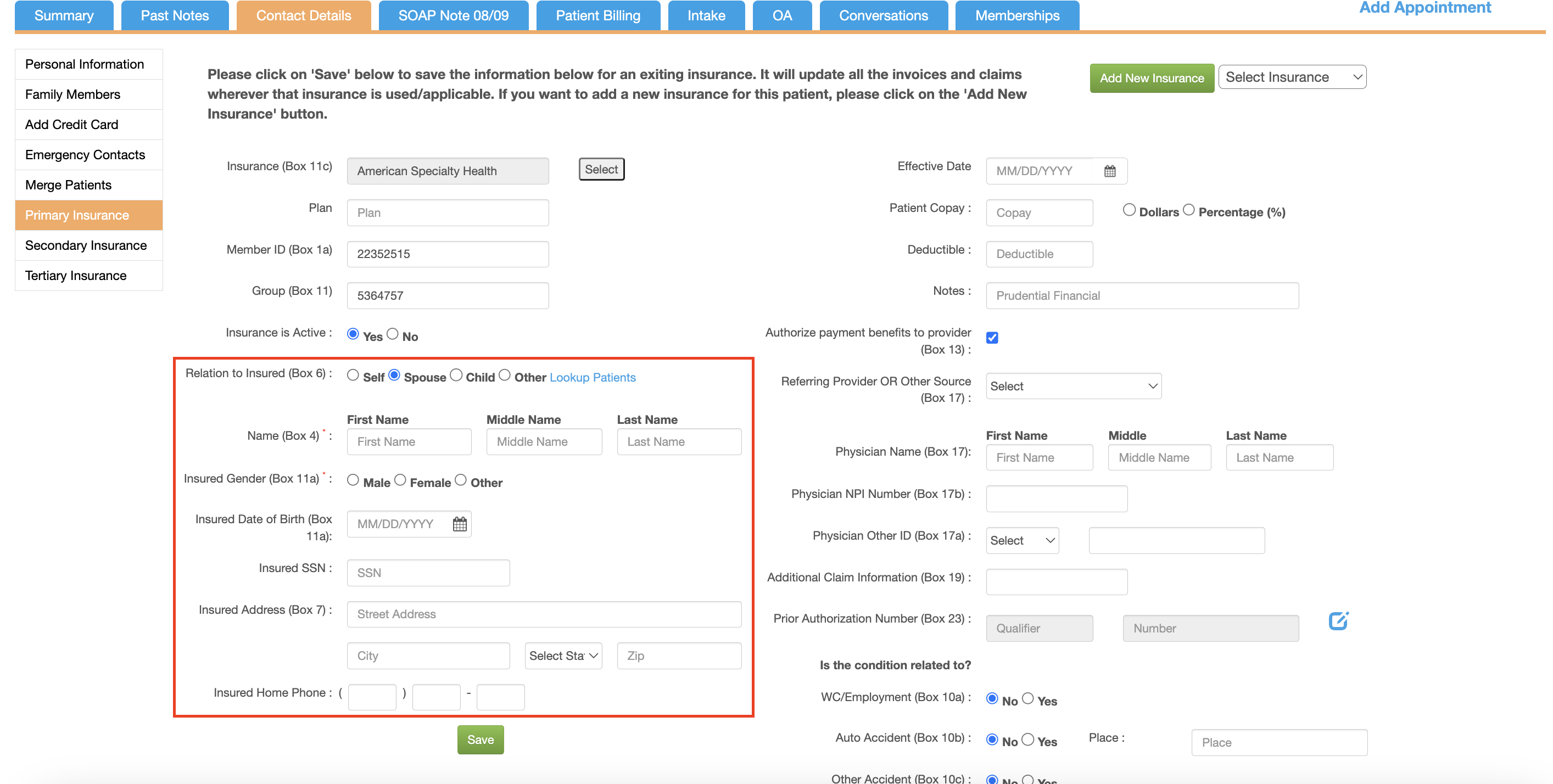 a. Select Secondary Insurance name b. Plan name c. Insurance Member ID. And, Group ID if required. d. Click "Yes" for Insurance is Active e. Relation to Insured f. Effective Date for the Insurance g. Patient Copay h. Deductible in dollars or percentage i. Any Notes j. Keep the checkbox marked for "Authorize payment benefits to provider (Box 13)" k. Referring Provider OR Other Source (if available or required) l. Physician Name (Box 17) m. Physician NPI Number (Box 17b) n. Physician Other ID (Box 17a) (if available or required) o. Additional Claim Information (Box 19) p. Prior Authorization Number (Box 23) q. Is the condition related to? - WC/Employment, or Auto Accident, or Other Accident along with Claim # (Box 11b) r. Attorney Information (if available of required) s. Click "Save" |