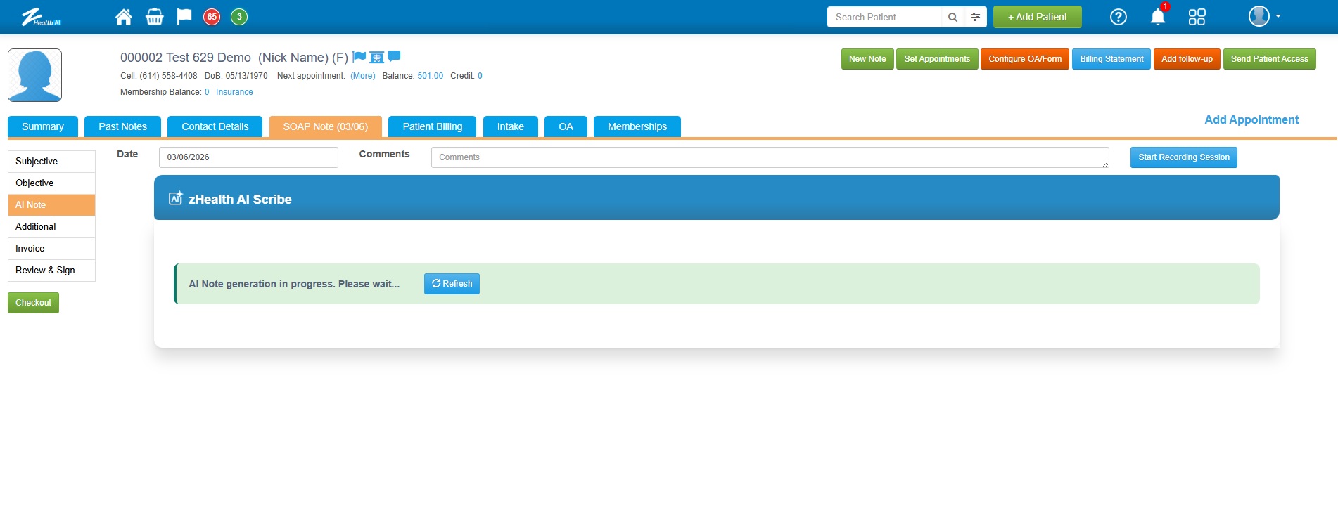 ![]() 6. Once the provider stops the recording session, the AI begins analyzing the conversation and securely processes it on the backend. While the processing is in progress, a message will be displayed indicating that the AI Note is being generated. To view the generated note, refresh the page. You can click the "Refresh" button shown in the image here. ![]() Note: The processing time may vary depending on the length of the recording. |