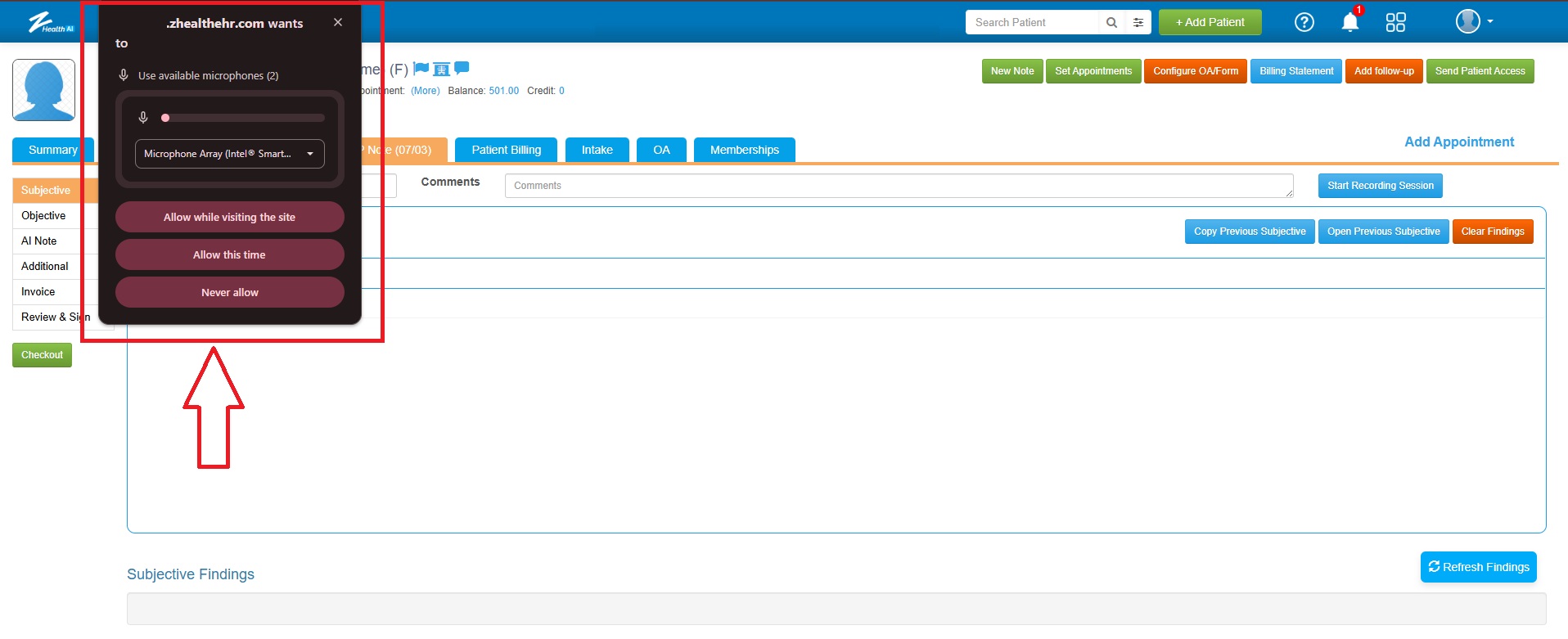 ![]() 2. Since the AI Scribe works by securely listening to the conversation between the provider and the patient, the user must ensure that microphone permission is granted to the browser for https://www.zhealthehr.com/ If the zHealth system requests microphone access, a pop-up will appear in the top-left corner of the Chrome browser. Click "Allow While Visiting This Site" to grant the microphone permission. ![]() To view instructions for the Chrome browser. How to grant microphone permission: [Click here] |