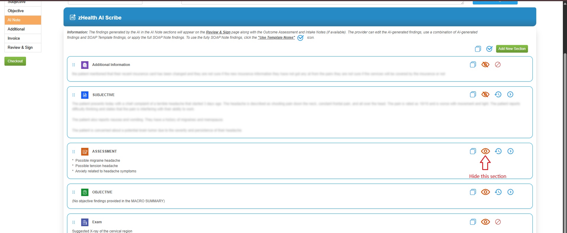![]() 5. The user has the option to hide or unhide a section. To do this, click the "Eye" icon located in the top-right corner of the section. ![]() Note: Sections marked as hidden will not appear in the Review and Sign screen and will be excluded from the signed note. However, the user can return to the AI Note section at any time to unhide them and include them in the note. |