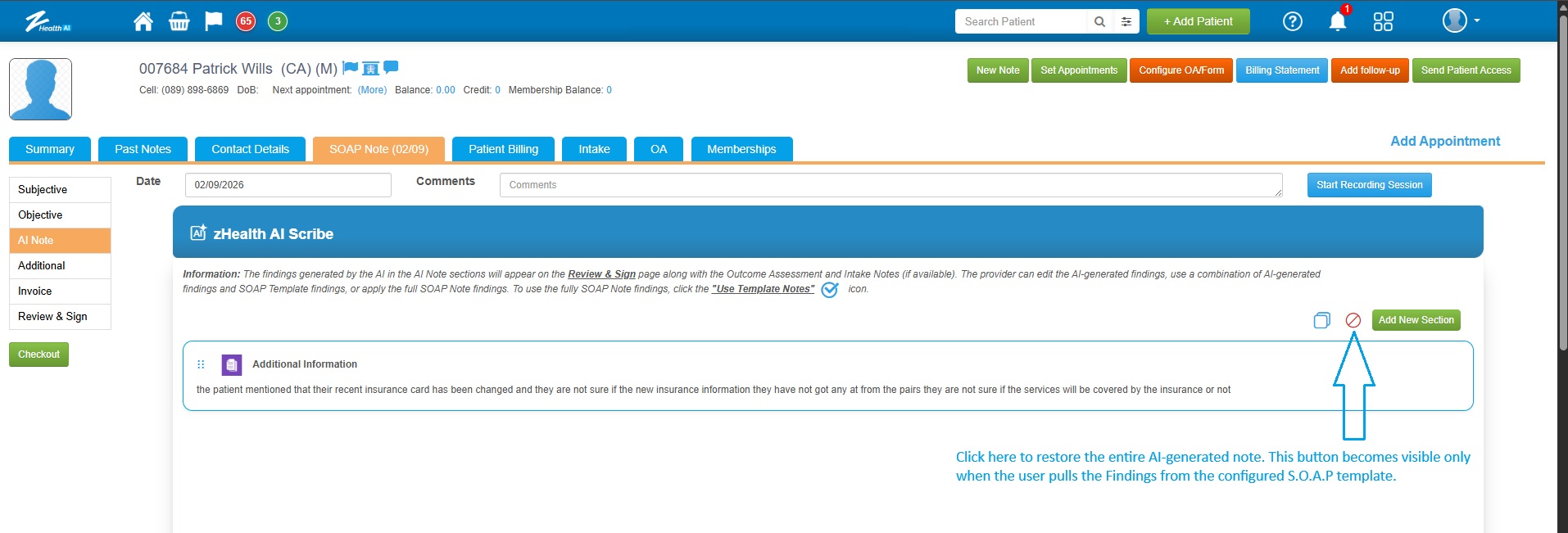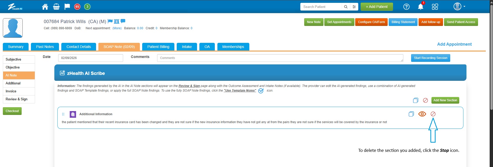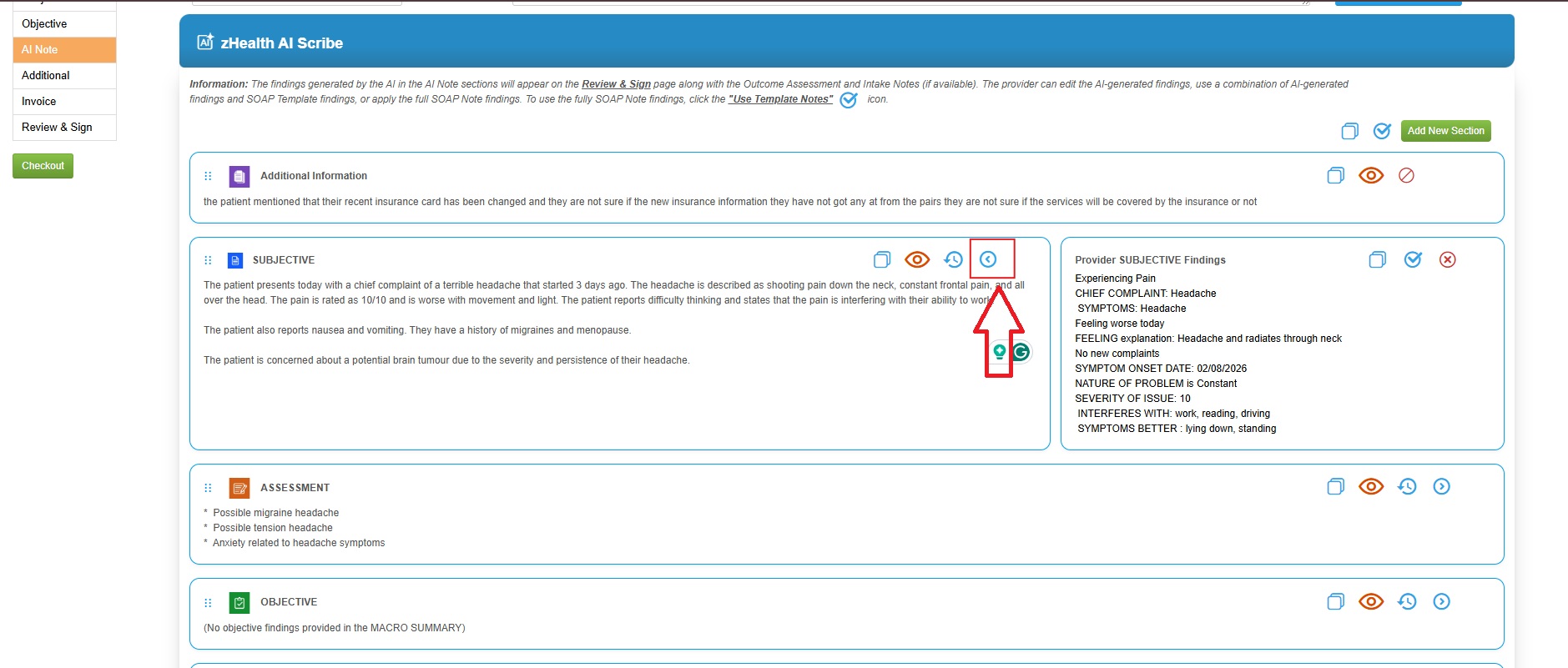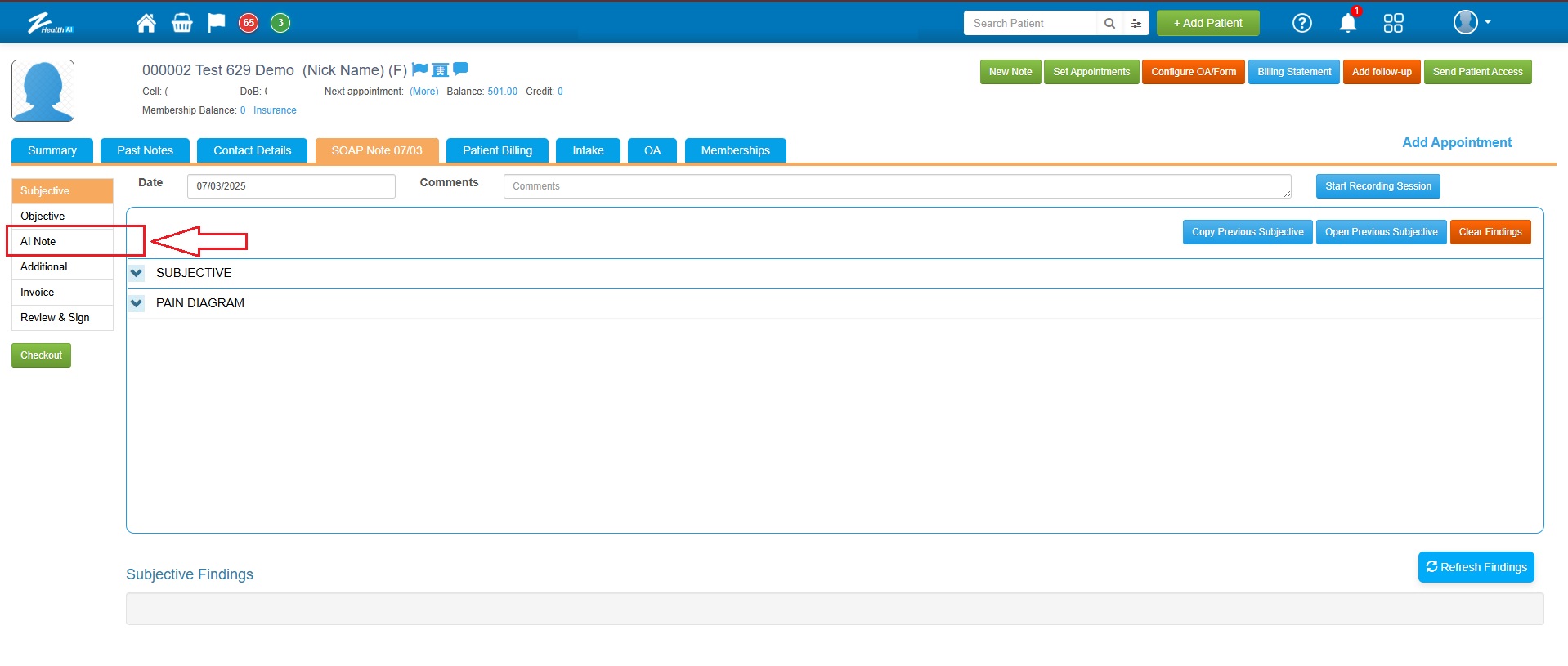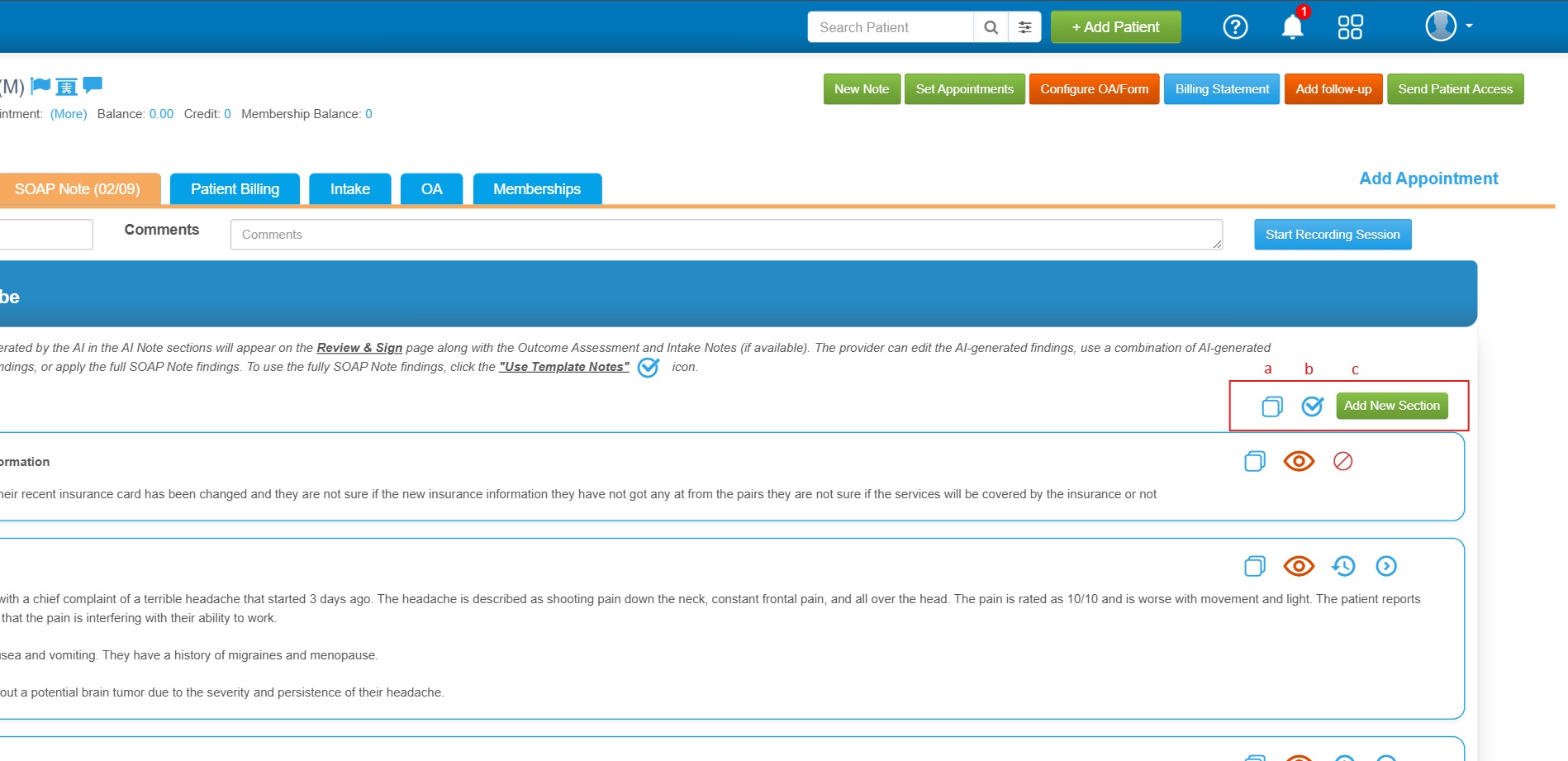![]() 1. If the practice has the AI Scribe feature enabled, a new subsection called "AI Note" will appear within the SOAP Note section. |