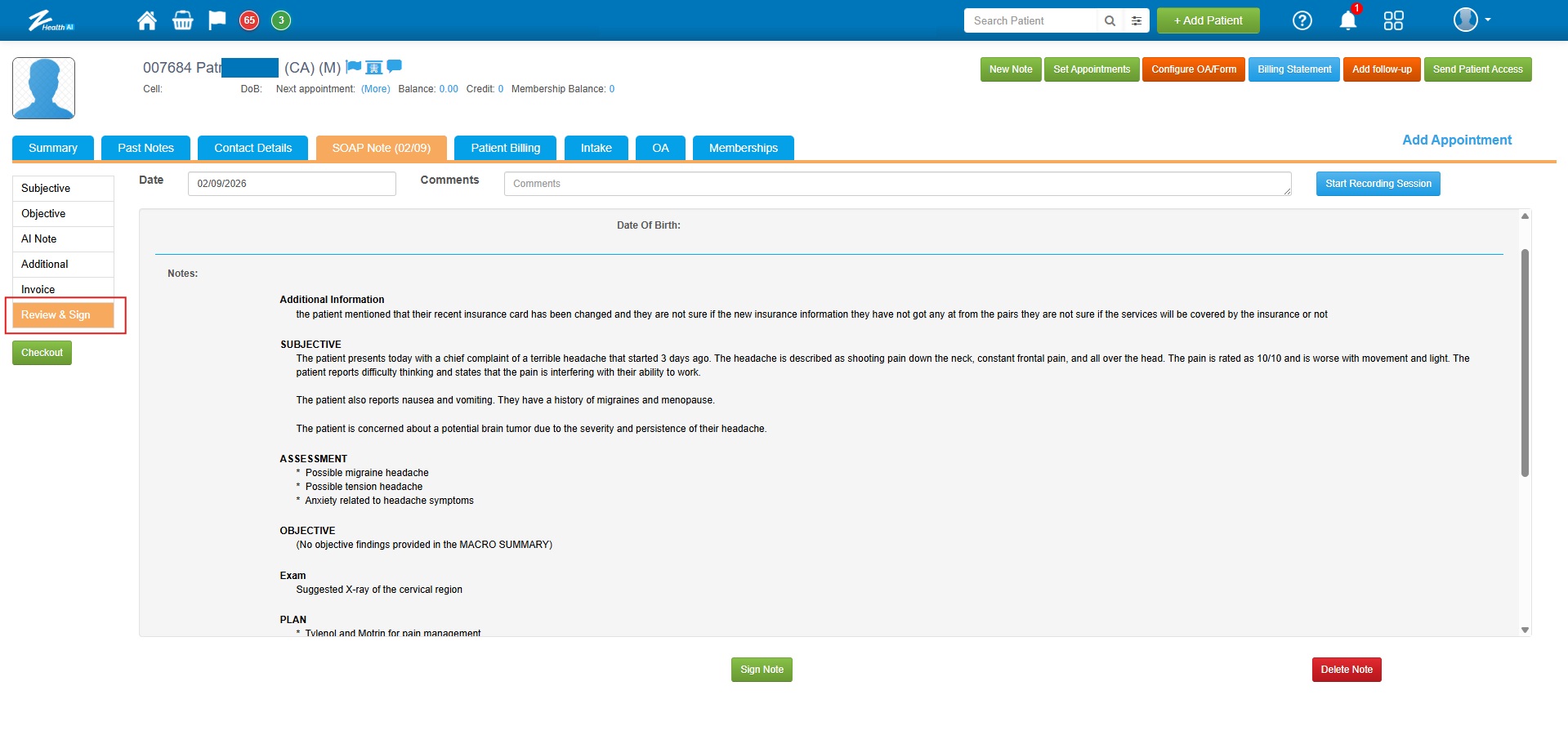 ![]() 8. The Review and Sign section of the SOAP Note displays findings from the AI Note, Intake findings, and Outcome Assessment (if available), allowing the provider to review, finalize, and sign the S.O.A.P. Note. ![]() Note: If the AI Note is not generated, the Review and Sign section of the SOAP Note will instead populate findings from the configured S.O.A.P. template, along with the Intake and Outcome Assessment findings (if available). |