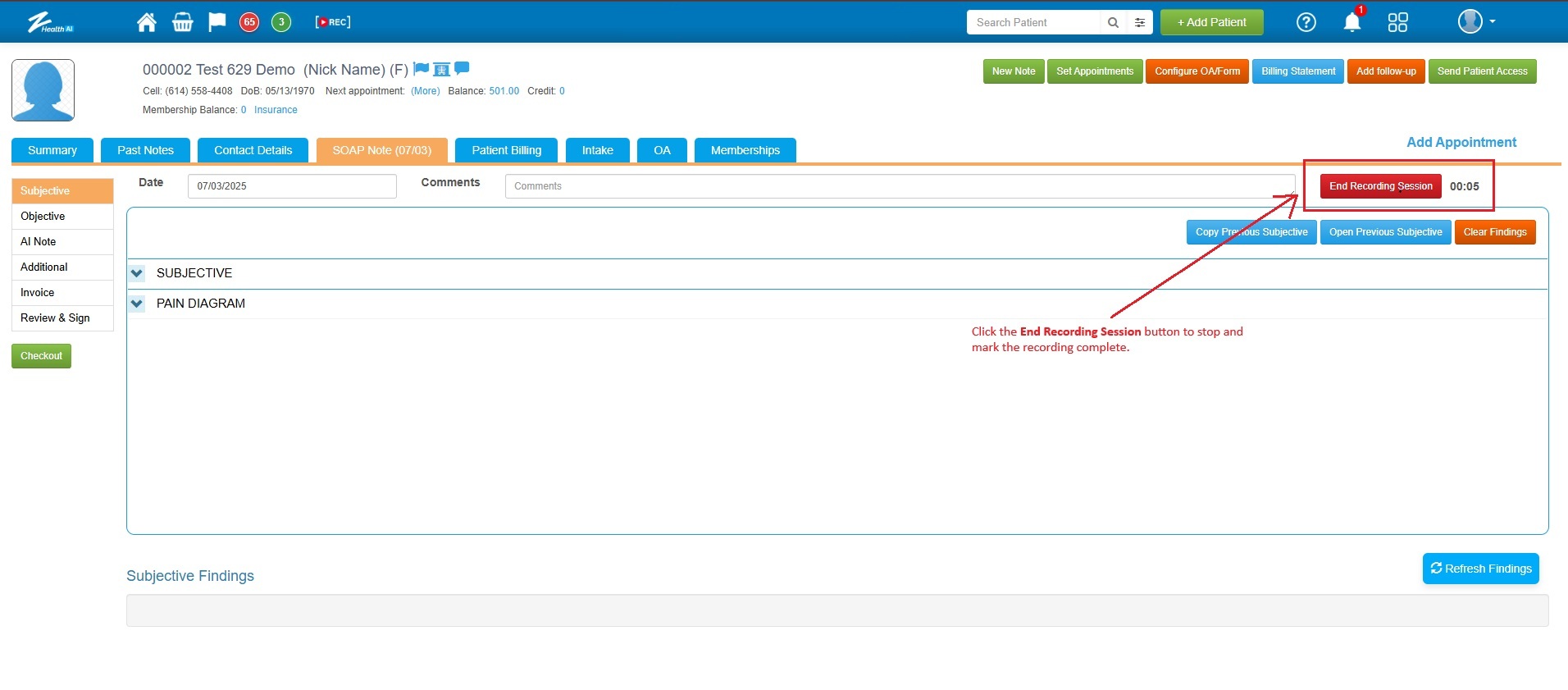 ![]() 4. Once the provider starts the recording, the button will change to "End Recording Session". Click this button to stop the recording and mark the session as completed. Note: It is important to complete the session recording. Once the recording is finished, the AI will begin analyzing the conversation and generate the AI SOAP Note, which will then be displayed in the "AI NOTE" section. |