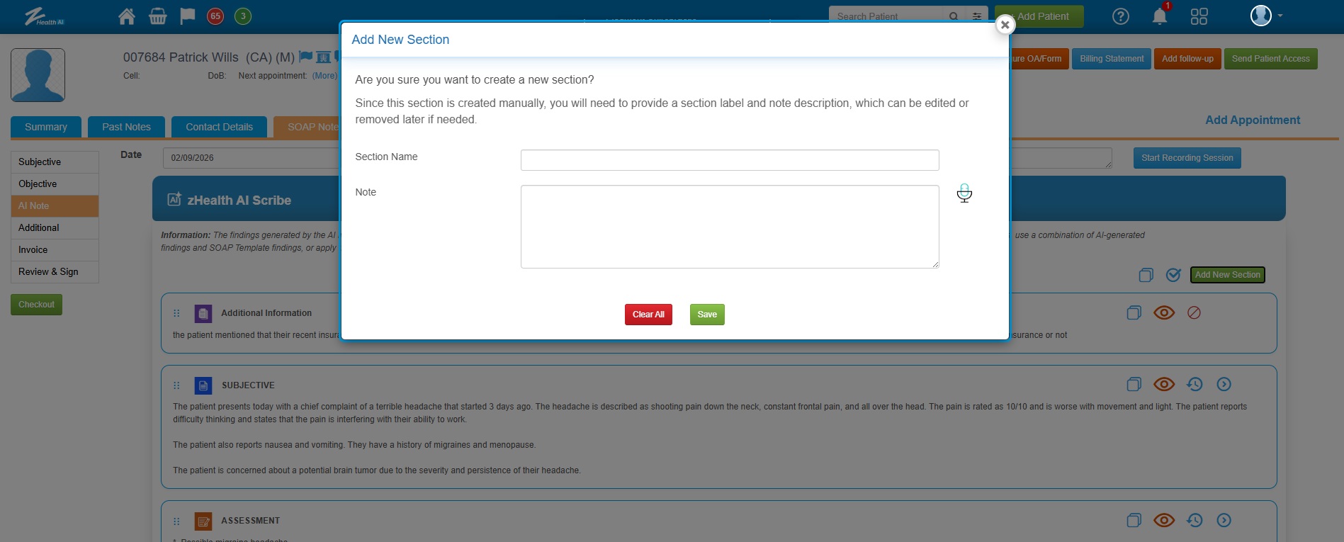 ![]() 2. To add a new section to the AI Note, click the Add New Section button. This will open a pop-up window where you can enter the section name and the details. You also have the option to dictate the details you want to include. |