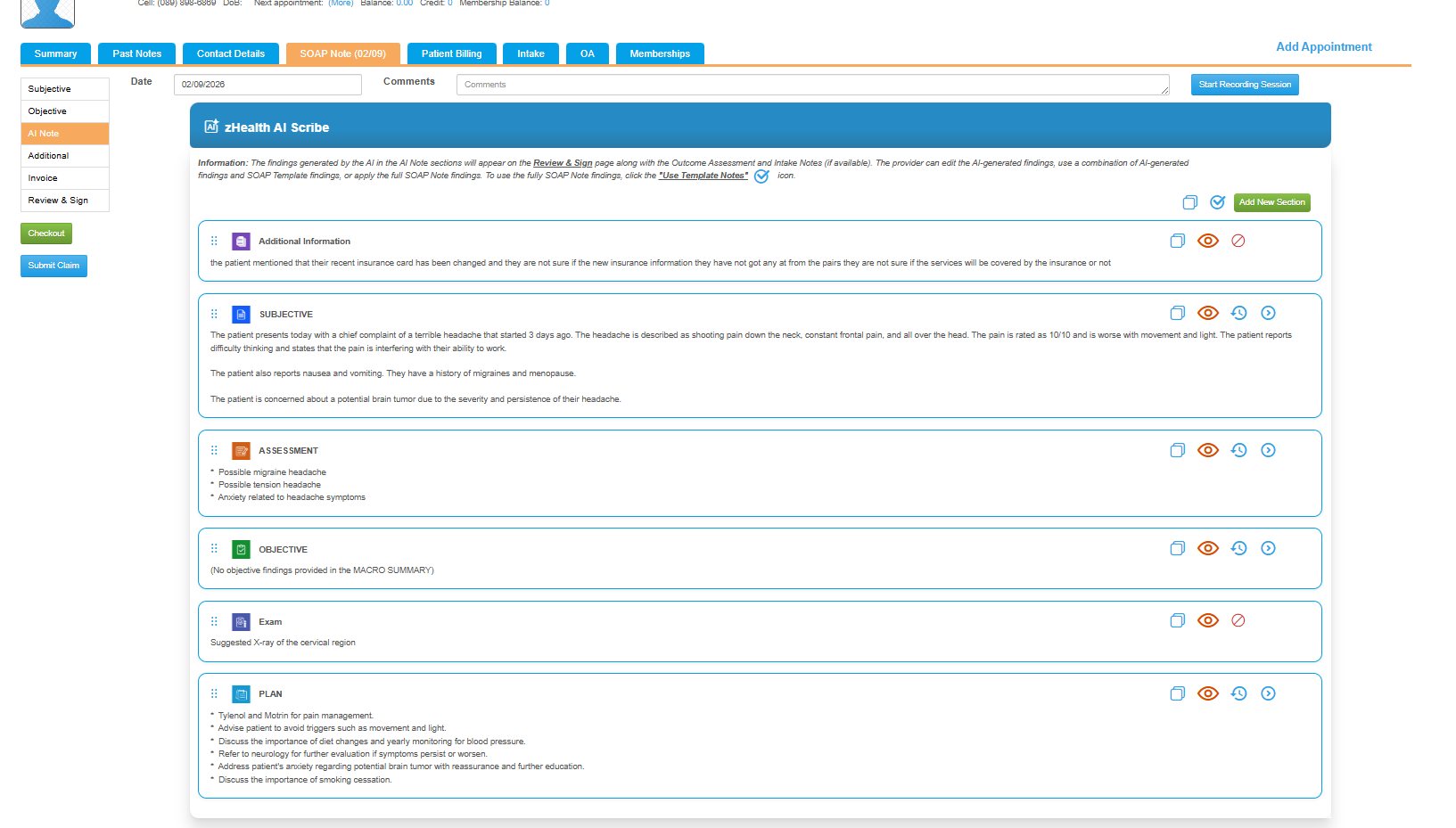 ![]() 7. Once the recording is saved and processed by the system, the S.O.A.P. note will be automatically generated in the AI Note section. ![]() Note: The provider can modify, edit, add additional sections, or reorder content and more in the AI Note section. |