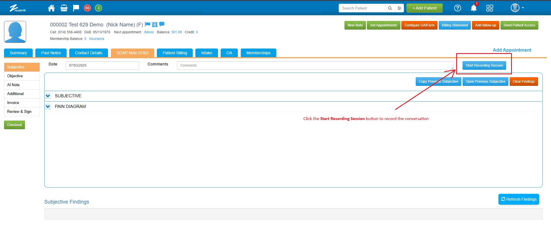 ![]() 3. Once the patient is checked in and in the clinical room, the provider should click the "Start Recording Session" button in the SOAP Note section of the patient's file. The Start Recording button is located in the top-right corner of the SOAP Note, next to the "Comment" field. This allows the AI to listen to the conversation so it can analyze the conversation and generate the SOAP note i.e., Subjective, Objective, Assessment, and Plan. |