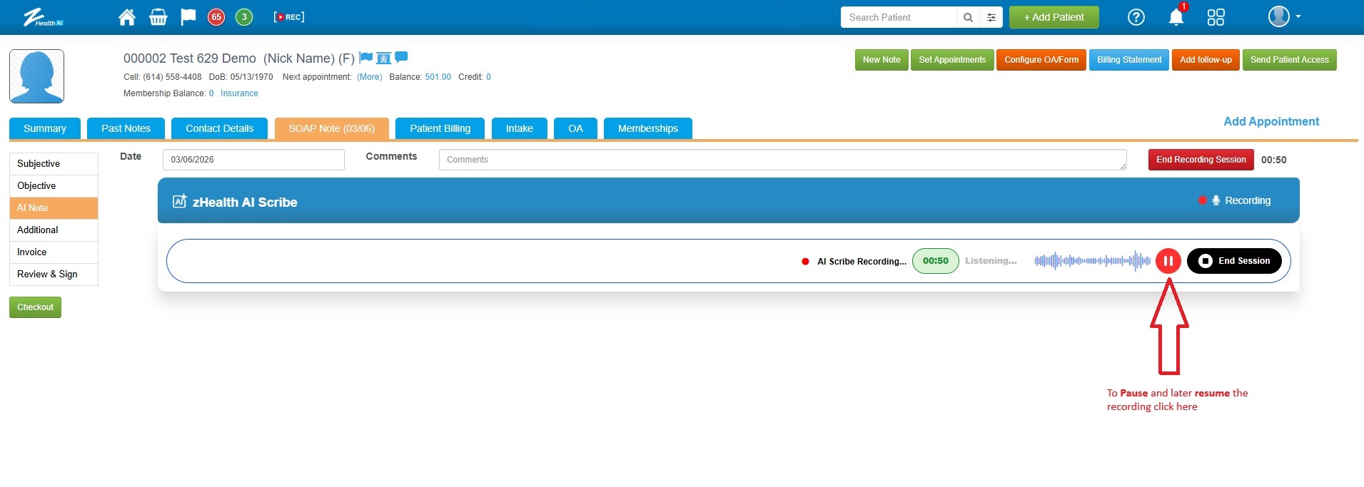 ![]() 5. There may be instances when you do not want to end the recording, such as when you need to take an urgent phone call. In such cases, you can click the "Pause" button and resume the recording later. To do this, go to the AI Note section within the SOAP Note and click the Pause icon located in the top-right corner next to the Equalizer to pause the recording (as shown in the image here). Once paused, the button will change to "Resume". Click it again to continue the recording. ![]() Note: If you are logged into your zHealth account on multiple devices, you can pause the recording session on one device and resume the recording session on another device. |