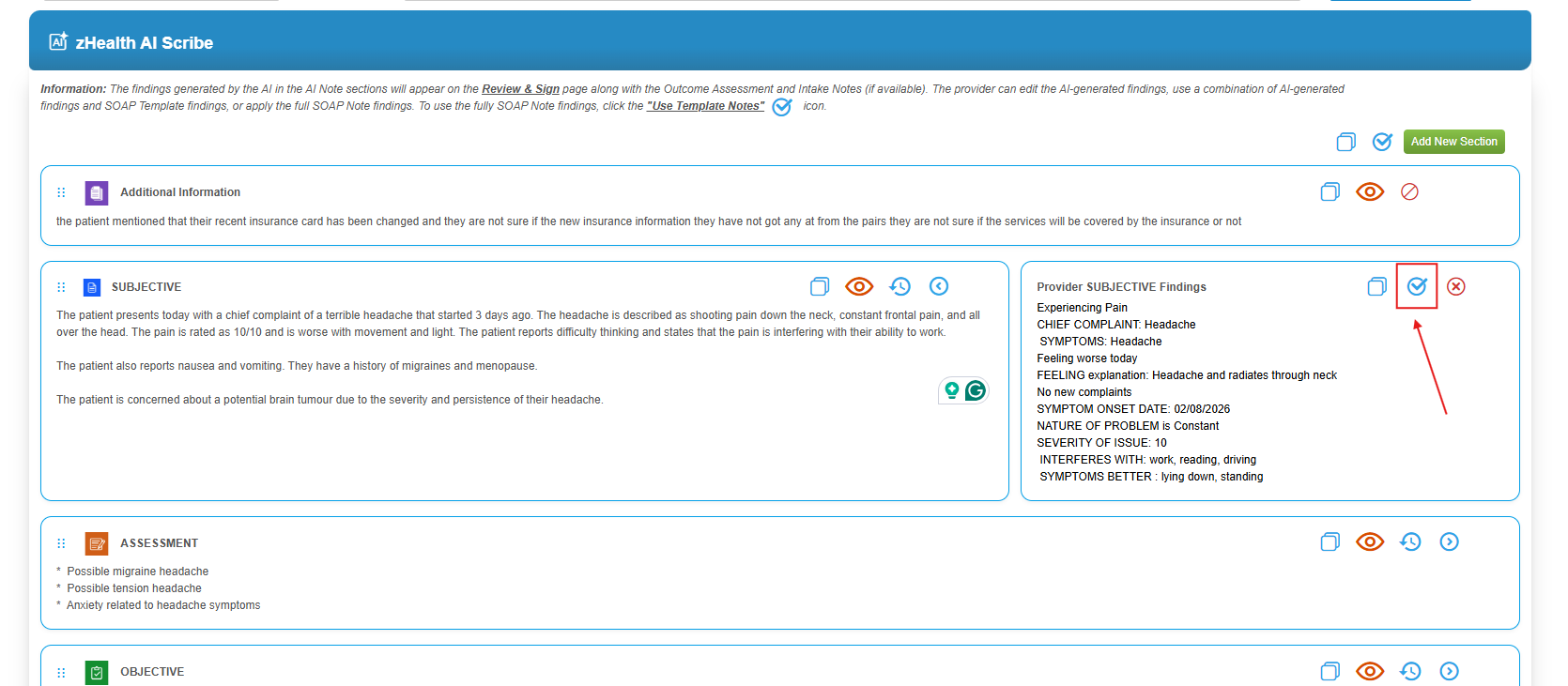 ![]() 7. There may be cases where the provider wants to use the findings from a specific section. Example: the configured Objective template while keeping the remaining content from the AI-generated note. In such cases, the provider can go to the Objective section within the AI Note, expand the section, and click the Use Template icon. This will replace the AI-generated Objective with the findings from the Objective template for that visit. |