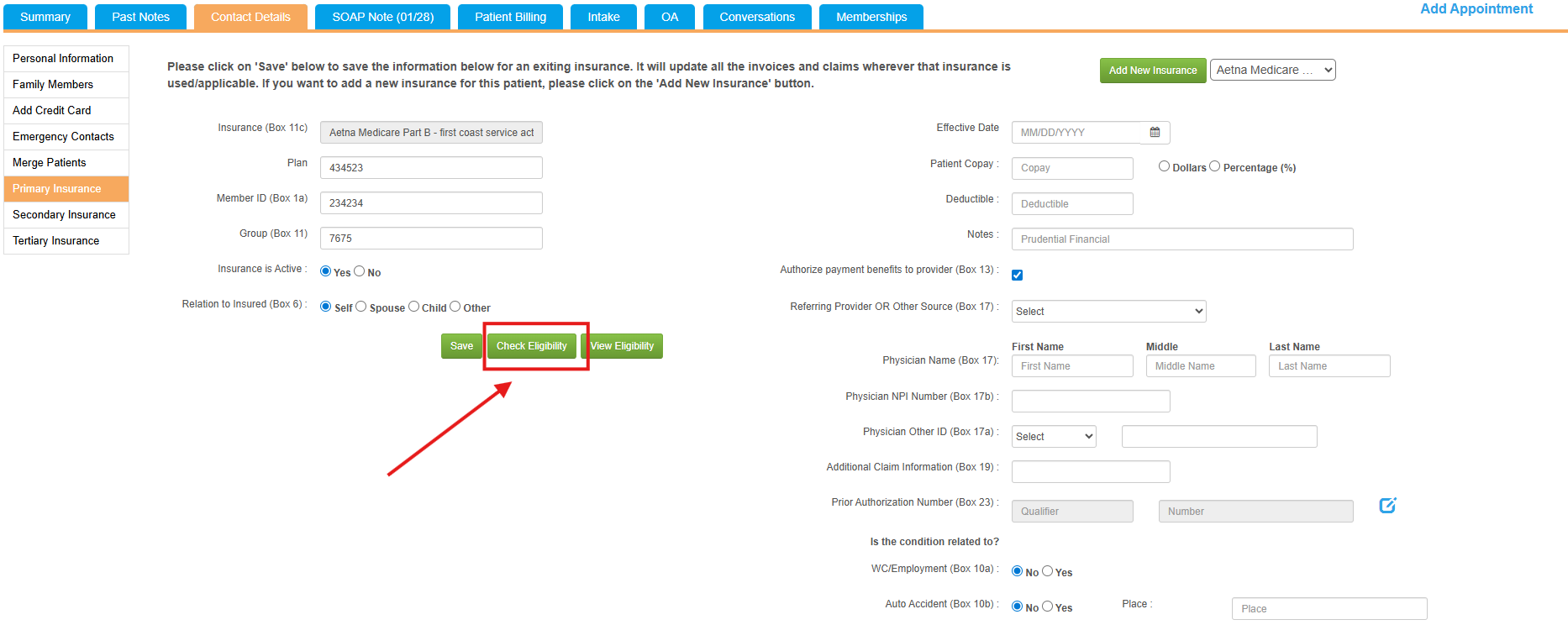 Primary/Secondary/Tertiary Insurance: In the patient's file/chart, the user can navigate to the "Contact Details" tab, open the "Primary/Secondary/Tertiary Insurance" sub-tab, enter the payer, then click the green "Check Eligibility" button to initiate the transaction. |