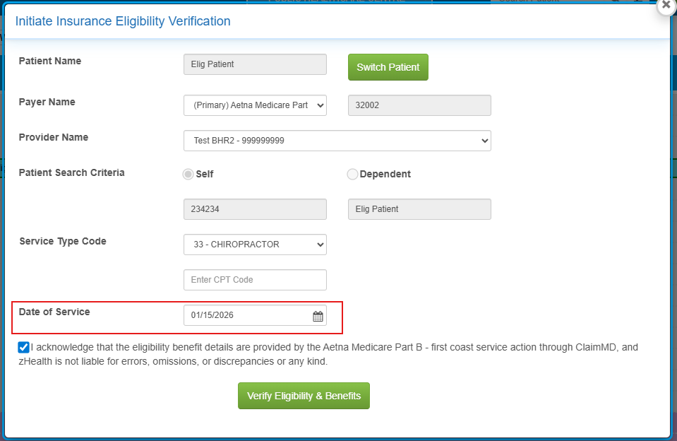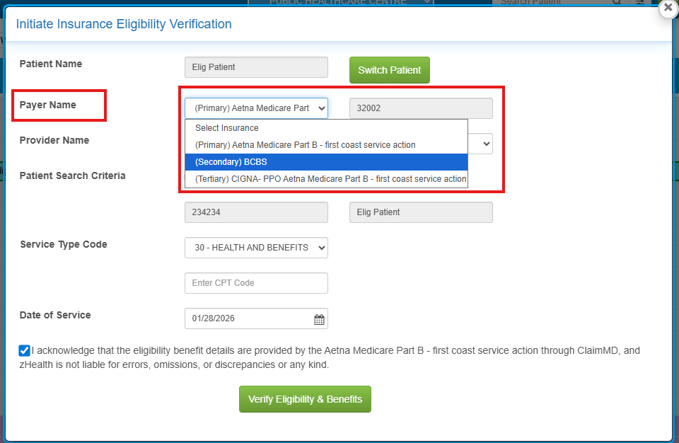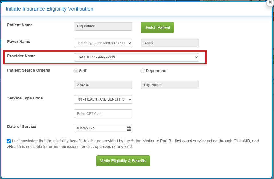 3. The "Provider Name" field displays a dropdown list of available providers or practices for the user to select from. This field may display either an individual provider (Individual NPI) or the practice name (Group NPI), depending on what is configured in the system/claim md clearinghouse. ![]() Note: Not all active providers or practices (Individual or Group NPIs) in the zHealth system will necessarily appear in the "Provider Name" dropdown when opening the "Check Eligibility" modal. Only providers or practices that are configured in the Claim MD clearinghouse will be displayed in the "Provider Name" field dropdown. |