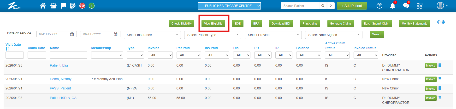 ![]() Billing Centre: In the zHealth system, a new "View Eligibility" button has been added to the "Billing Centre" page. Practices can use this button to initiate Eligibility and Benefits (E&B) verification transactions. ![]() Note: When clicking the "View Eligibility" button in the "Billing Centre", the practice must search for and select a patient. This allows the system to automatically pull the required information from the patient's file to initiate the E&B Verification request. |