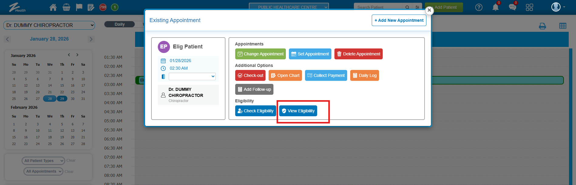 ![]() Scheduled Appointment: On the appointment calendar, clicking a scheduled appointment (or the gear icon in the daily view) opens a modal window that has a new blue "View Eligibility" button. |