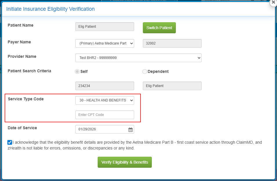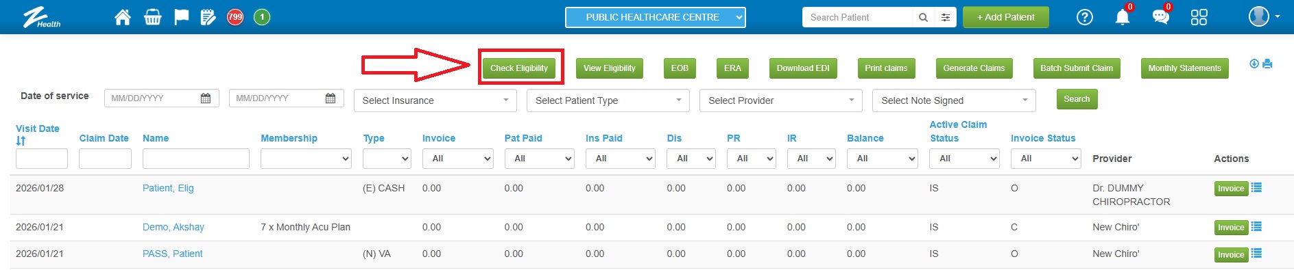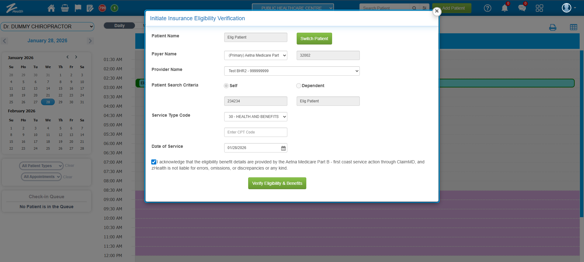 Billing Centre: In the zHealth system, a new "Check Eligibility" button has been added to the "Billing Centre" page. Practices can use this button to initiate Eligibility and Benefits (E&B) verification transactions. Note: When clicking the "Check Eligibility" button in the "Billing Centre", the practice must search for and select a patient. This allows the system to automatically pull the required information from the patient's file to initiate the E&B Verification request. |
