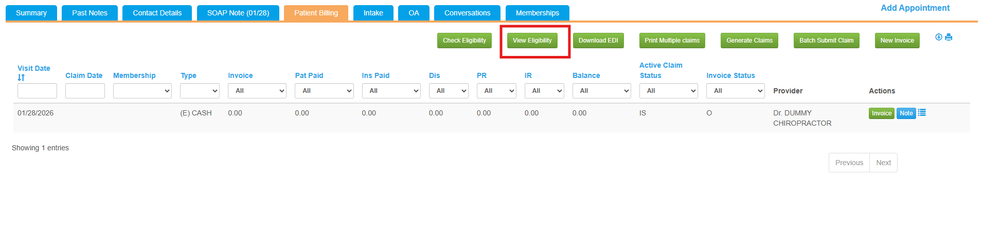 ![]() Patient Billing: Within the patient's file/chart, the user can navigate to the "Patient Billing" tab, where a new green "View Eligibility" button is available. Clicking this button initiates the Eligibility and Benefits (E&B) verification transaction. |