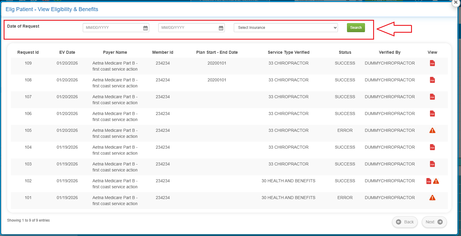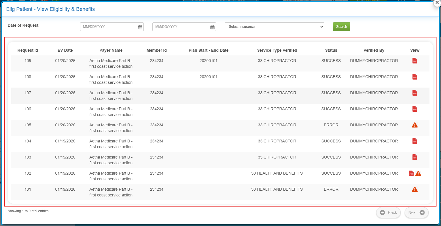 ![]() Note: If no filters are applied, the system will display all E&B verifications performed for the patient across all insurance plans on file. |