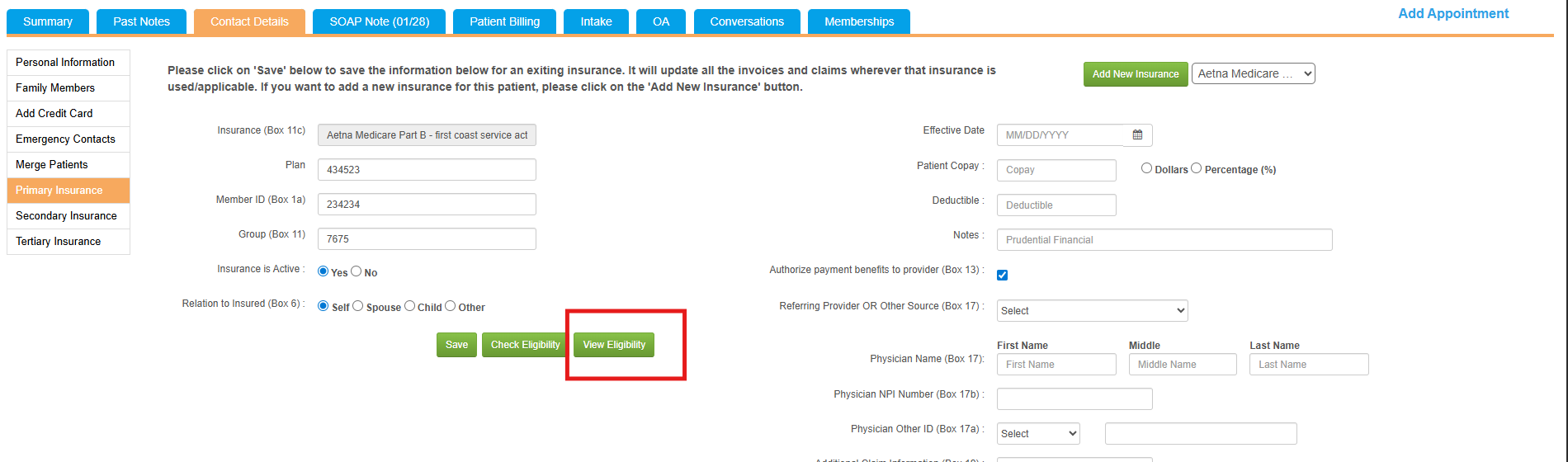 ![]() Primary/Secondary/Tertiary Insurance: In the patient's file/chart, the user can navigate to the "Contact Details" tab, open the "Primary/Secondary/Tertiary Insurance" sub-tab, enter the payer, then click the green "View Eligibility" button to initiate the transaction. |