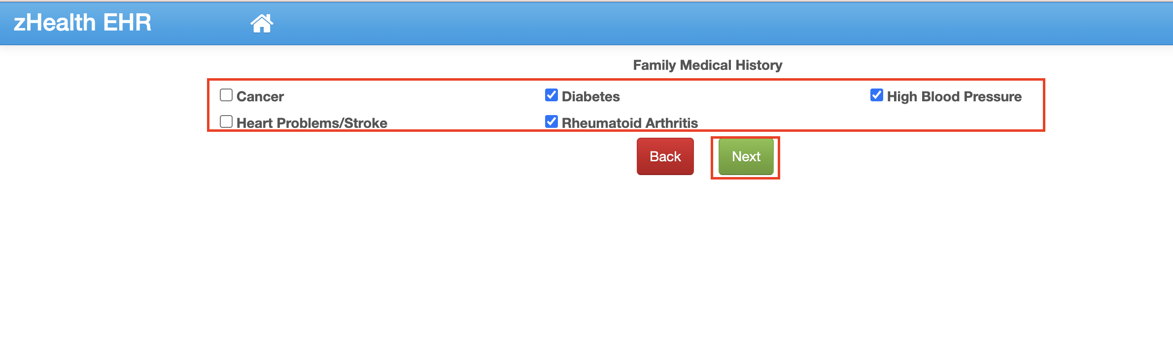 9. On the Family History page, the patient should check the boxes in front of the conditions/diseases that his or her family member had in the past or currently has.