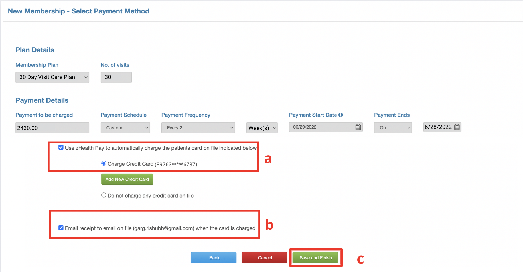 1 (i). Collecting Membership Payment using zHealth Paya. If you're a zHealth Pay user, payments can be scheduled to automatically process a card on file via zHealth Pay. - Click the checkbox to select zHealth Pay as the payment method. - Click on "Charge Credit Card number xxxx....xxxx" being displayed below the zHealth Pay option. Our system will use that credit card on the patient's file to collect membership payments using zHealth Pay. Or you can "Add New Credit Card" with card number and expiry date details and use that to collect payment through NCMIC or zHealth Pay. Note: If you're not a user of our zHealth Pay Payment Processing Solution and want to know more about it, contact your Customer Success Specialist or email us at support@zhealthehr.com. b. Click to select the checkbox for sending an email receipt to the email address on file. c. Click "Save and Finish" to complete the process. |