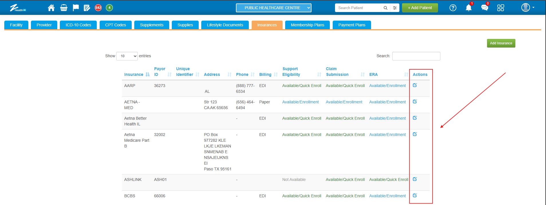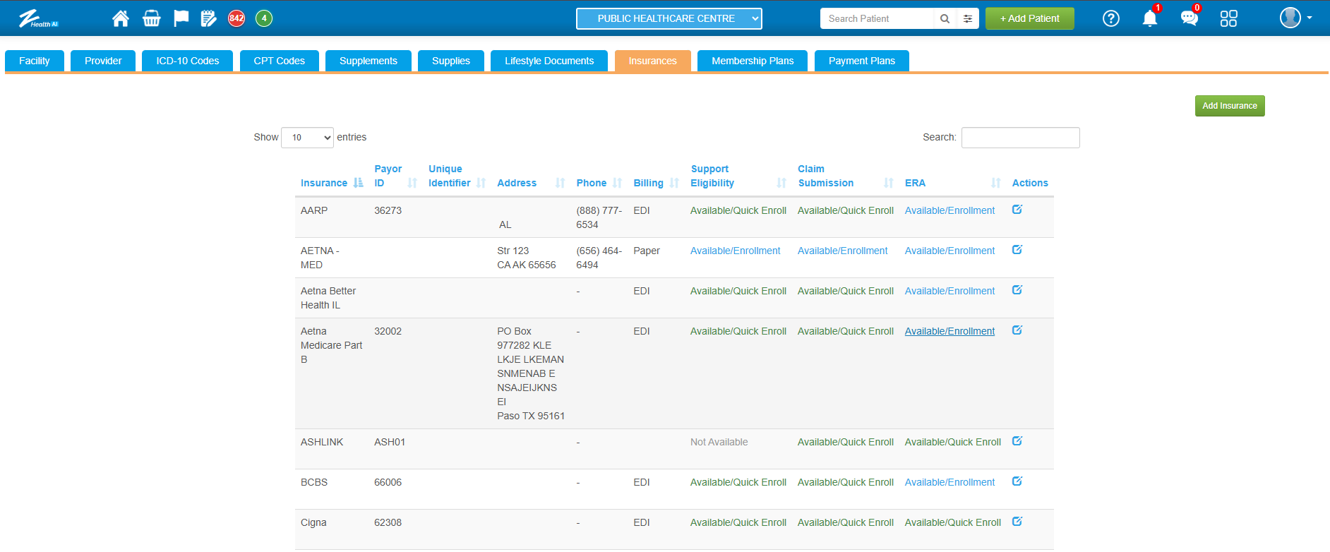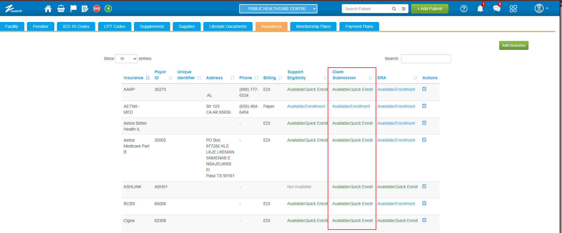 4. In the Insurance master tab, the “Claim Submission” column indicates whether the payer requires EDI pre-enrollment.