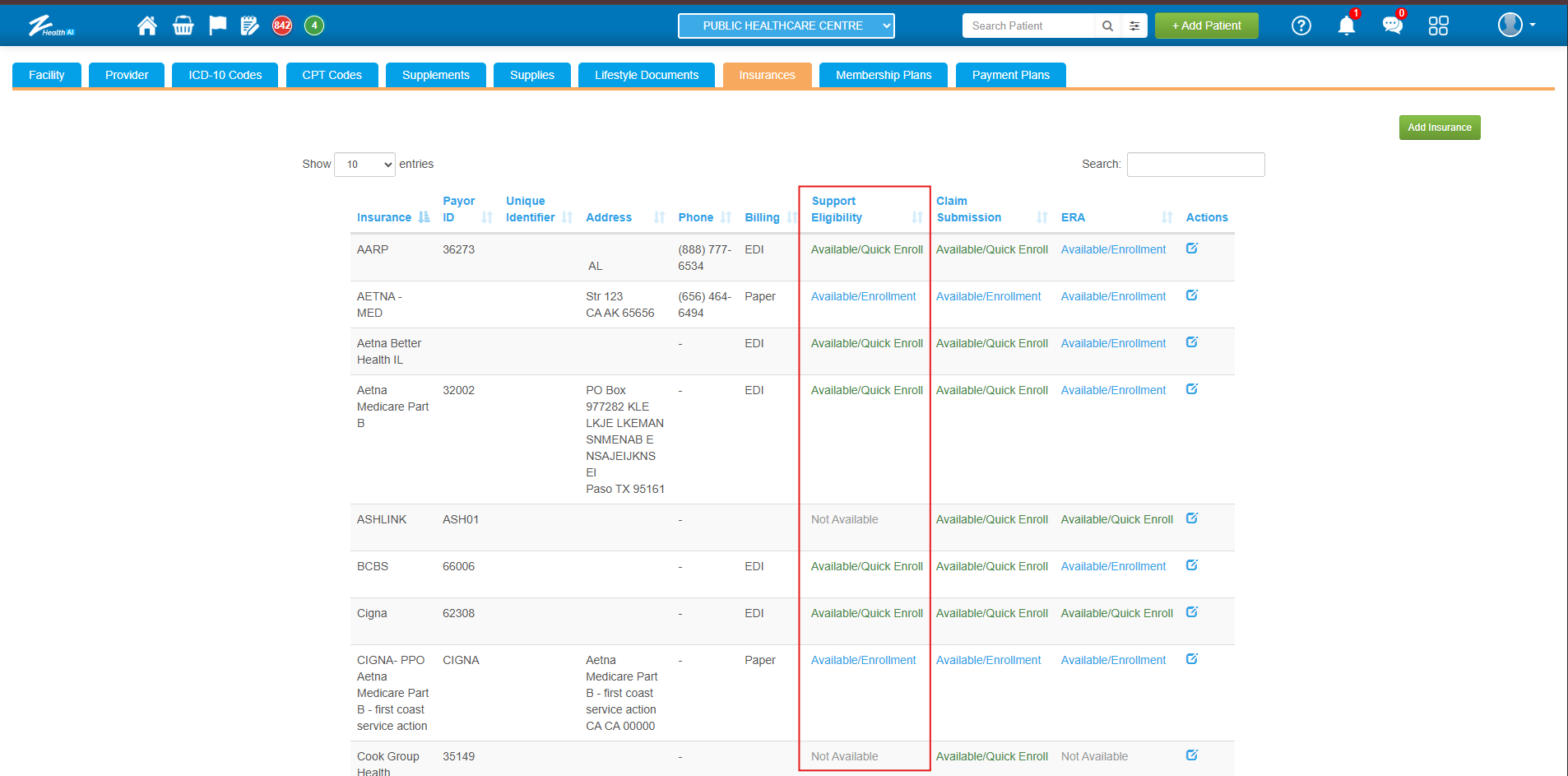4. In the Insurance master tab, the “Support Eligibility” column indicates whether the payer requires B&E Verification pre-enrollment.
