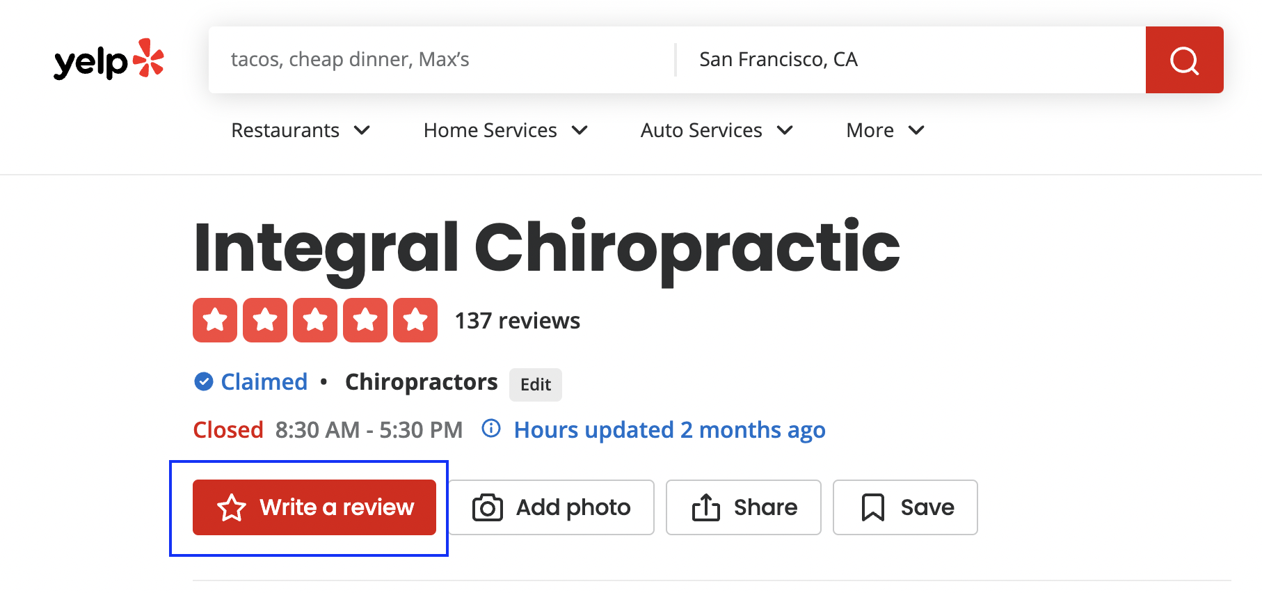 ![]() 3. A new window will open where users can write a review for your business. Copy the URL from the address bar. To copy the URL, click Command + A and Command + C on MacBook or iMac. To copy the URL, click Cltr + A and Cltr + C on PC. This is the review link* for your business listing on Yelp. |