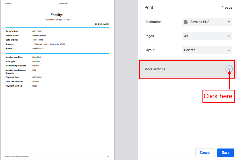 ![]() 4. On the pop-up window, click "More Settings" and follow the print command to print the patient membership payment invoice. |