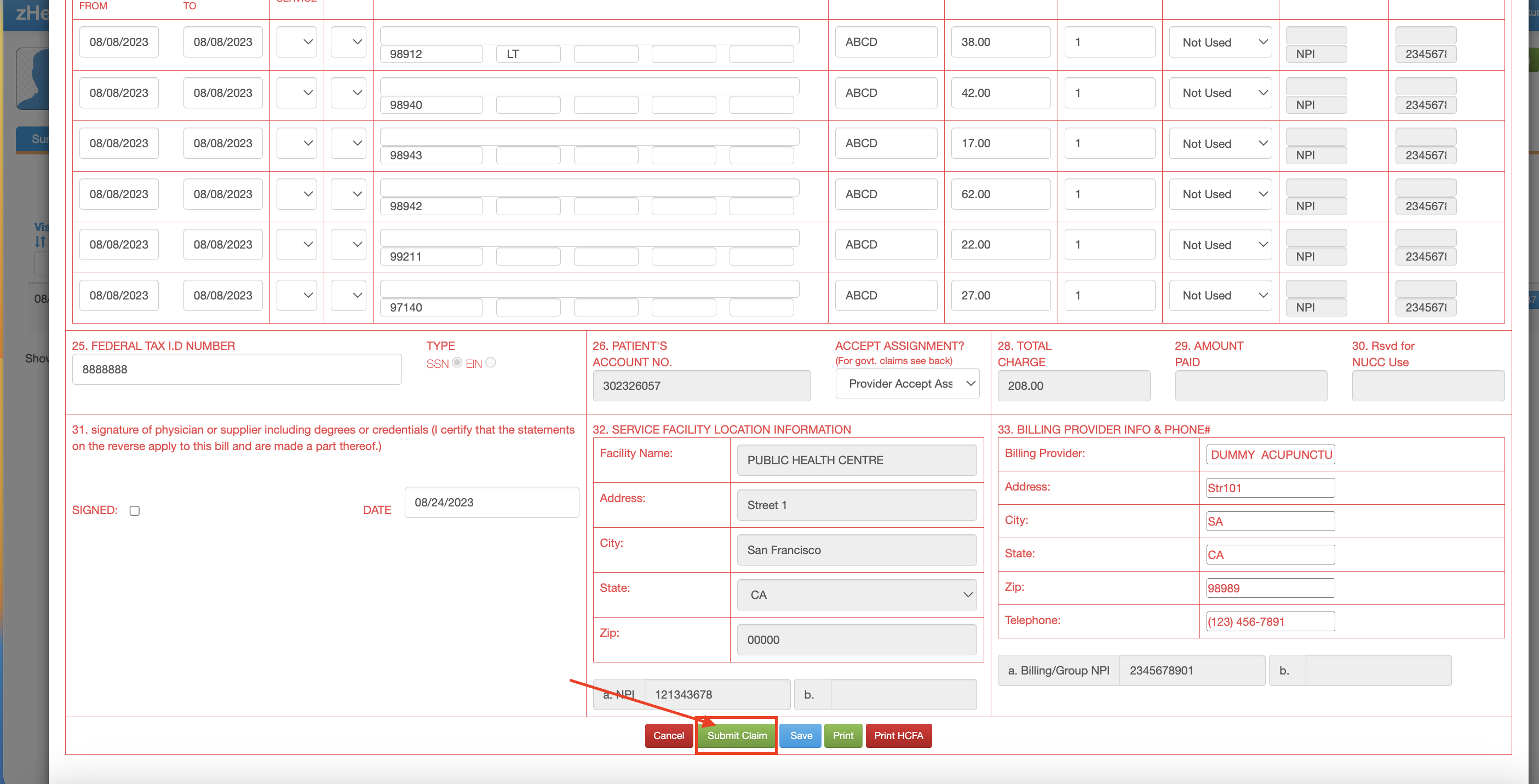 ![]() 2. Once you change the status, the HCFA form opens up automatically. Review the HCFA form, make changes if necessary, and click "Submit Claim". Navigate to the Patient Chart > Patient Billing tab. Find the claim. You will see the Active Claim Status as "2E", signifying that there isn't any error on this and you can resubmit the claim. |