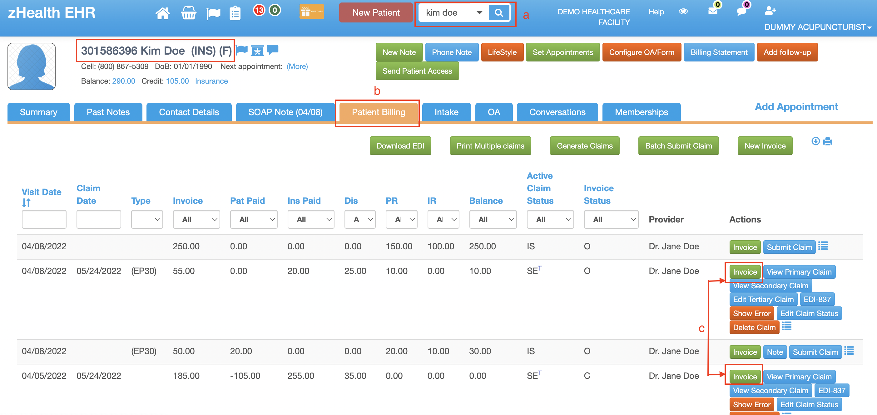 1a. First, you will have to search the patient name using the top navigation search box. Open the patient chart. b. When inside the patient chart, go to Patient Billing. c. Search for the invoice with the wrong ERA payment applied. When you find the invoice, click the invoice button and proceed to Step 2.