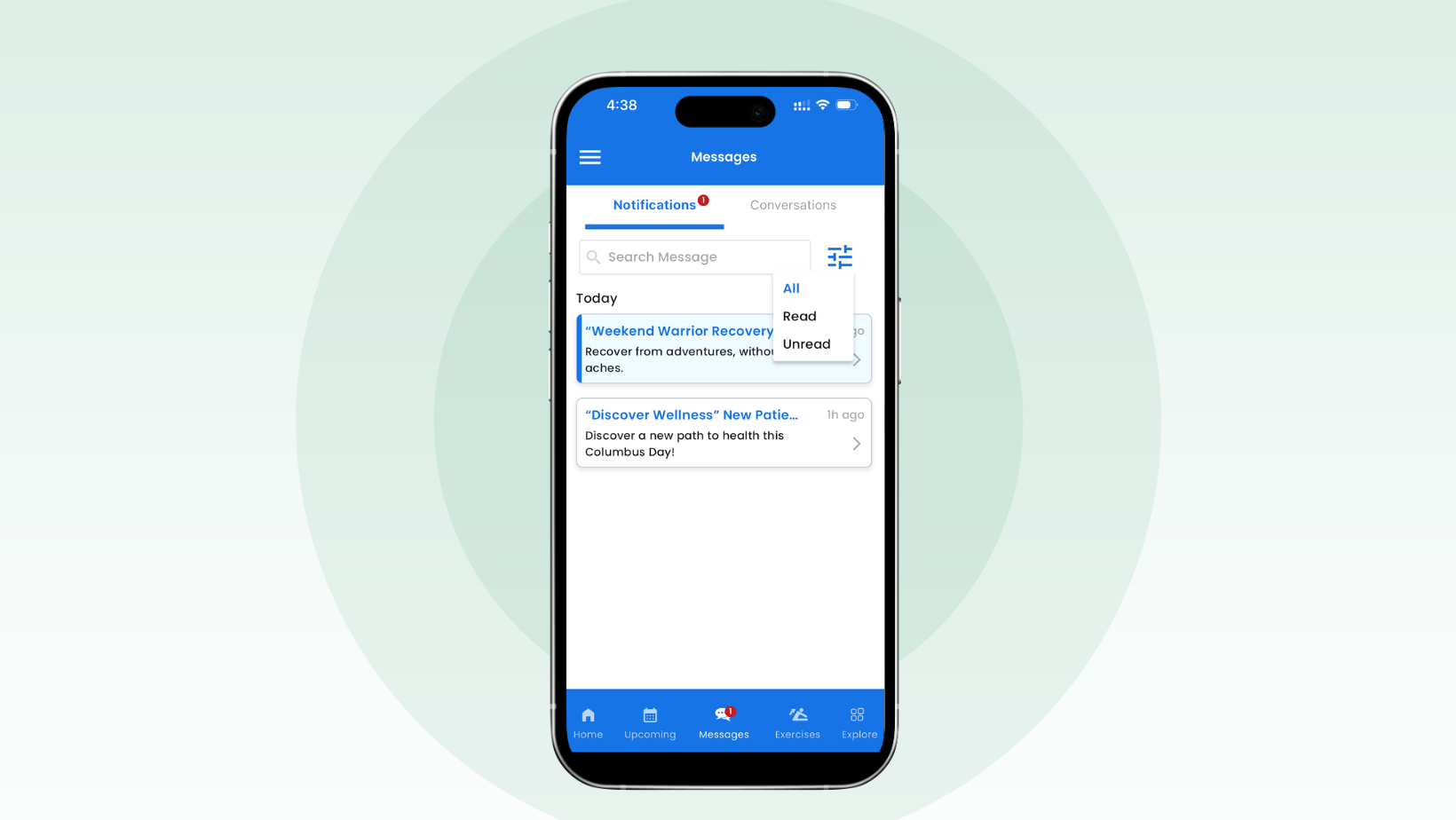 ![]() 5. The patient can find a specific notification by using the search field provided. They can also filter messages to show only read or unread notifications by applying the filter located next to the search field. ![]() Note: Unread notification messages are highlighted with a blue background, while read messages appear with a white background. |