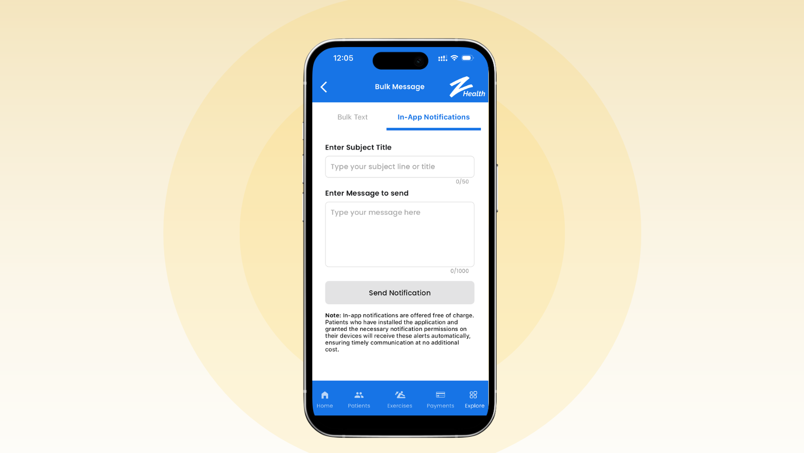 ![]() 4. To send a push notification to patients via In-App Notifications, two mandatory fields must be completed: the Subject Line and the Message Body. After completing both fields, click the "Send Notification" button to deliver the message to your patients. ![]() Note: Below both fields, the allowed character limit is displayed, along with a live count of the characters you've typed. |