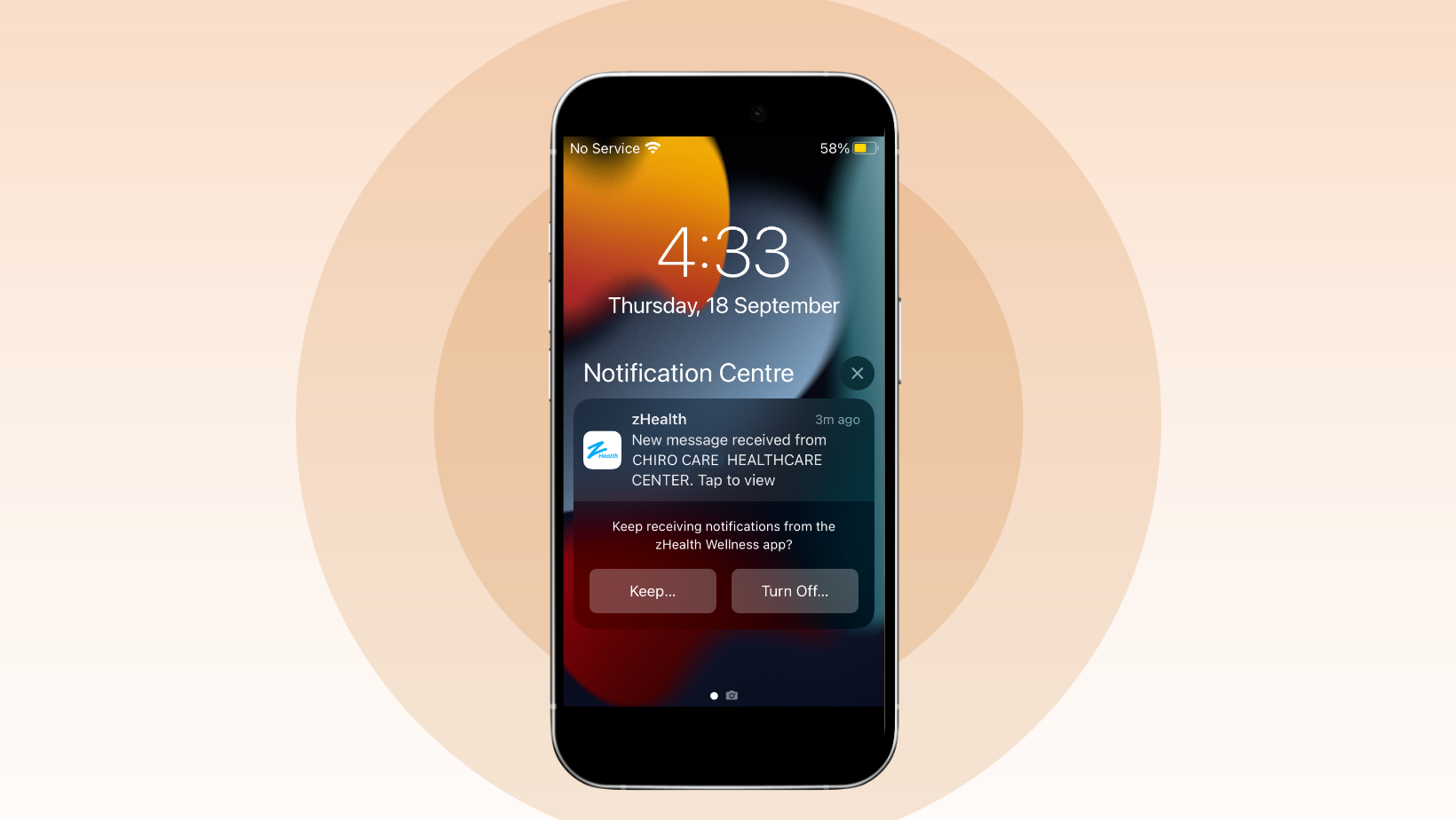 ![]() 1. Patients with the zHealth Mobile App installed will see the push notification banner, provided notifications are enabled for the app in their smartphone settings. The push notification banner shows the name of your practice, helping patients easily identify where the message is coming from and ensuring they don't miss important updates from your clinic. |