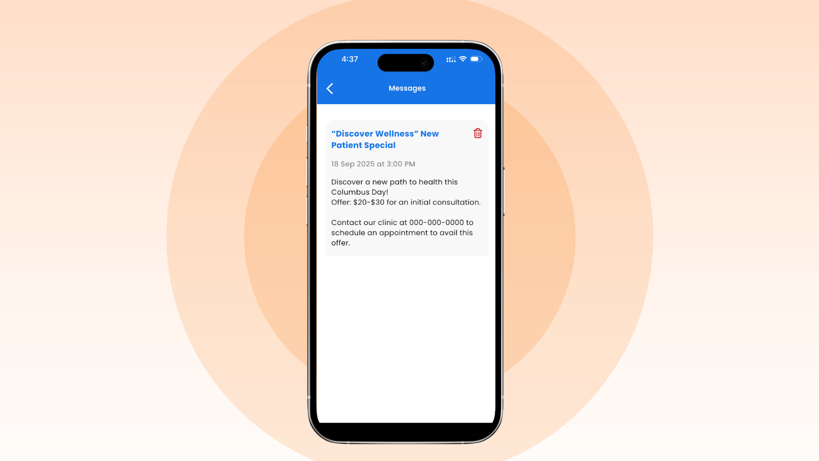 ![]() 4. The patient can tap the notification message listed under the "Notifications" tab within the Messages section of the Mobile App to view the complete message. ![]() Note: The patient can delete the message by tapping the trash can icon located at the top right corner of the full message. |