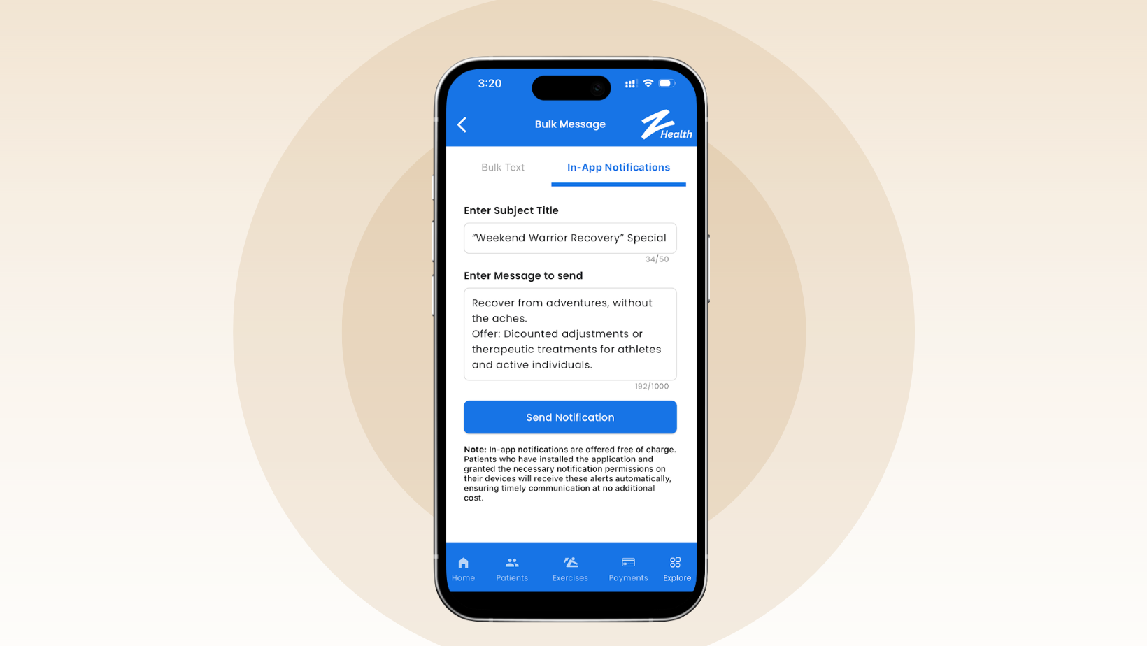 ![]() 3. Within the "Messages" section, you will see two features: Bulk Text and In-App Notifications. Select the "In-App Notifications" tab to compose the message you want to send to your patients as a push notification. |