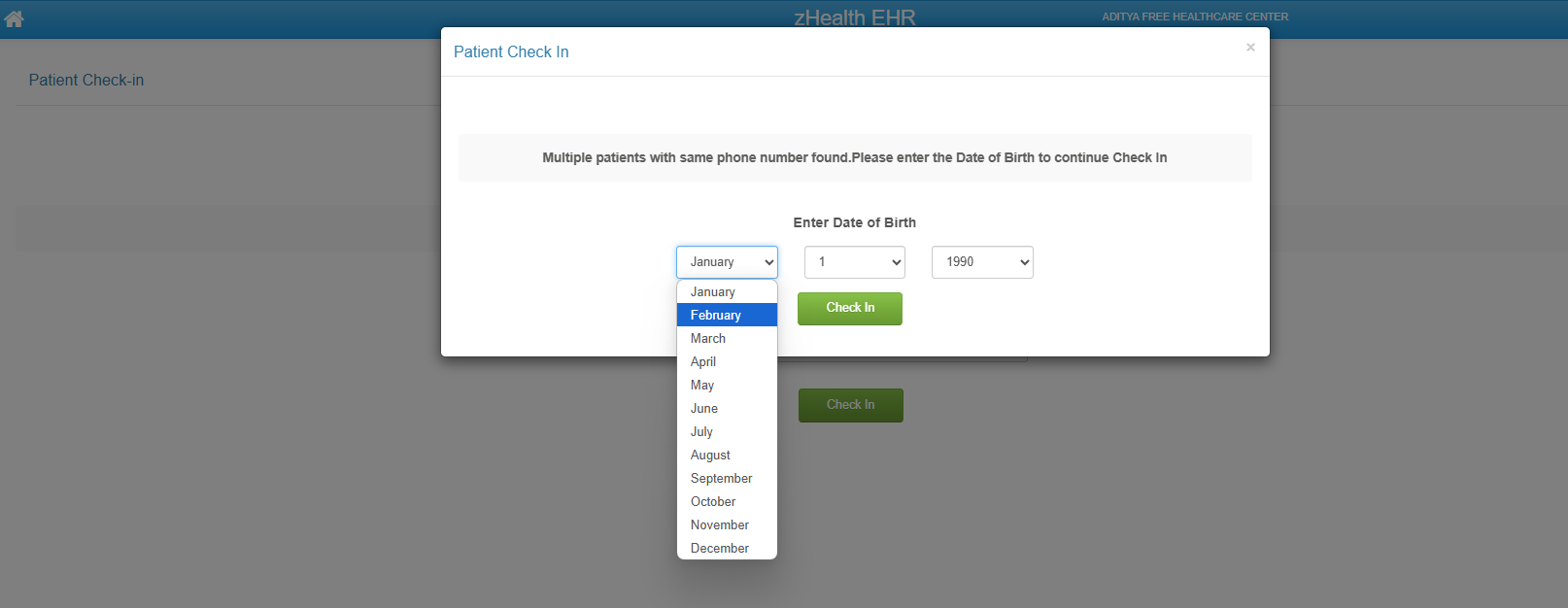 3. If the entered phone number is linked to multiple patient records, the system will detect this and prompt the user to enter the date of birth of the patient they wish to check in.