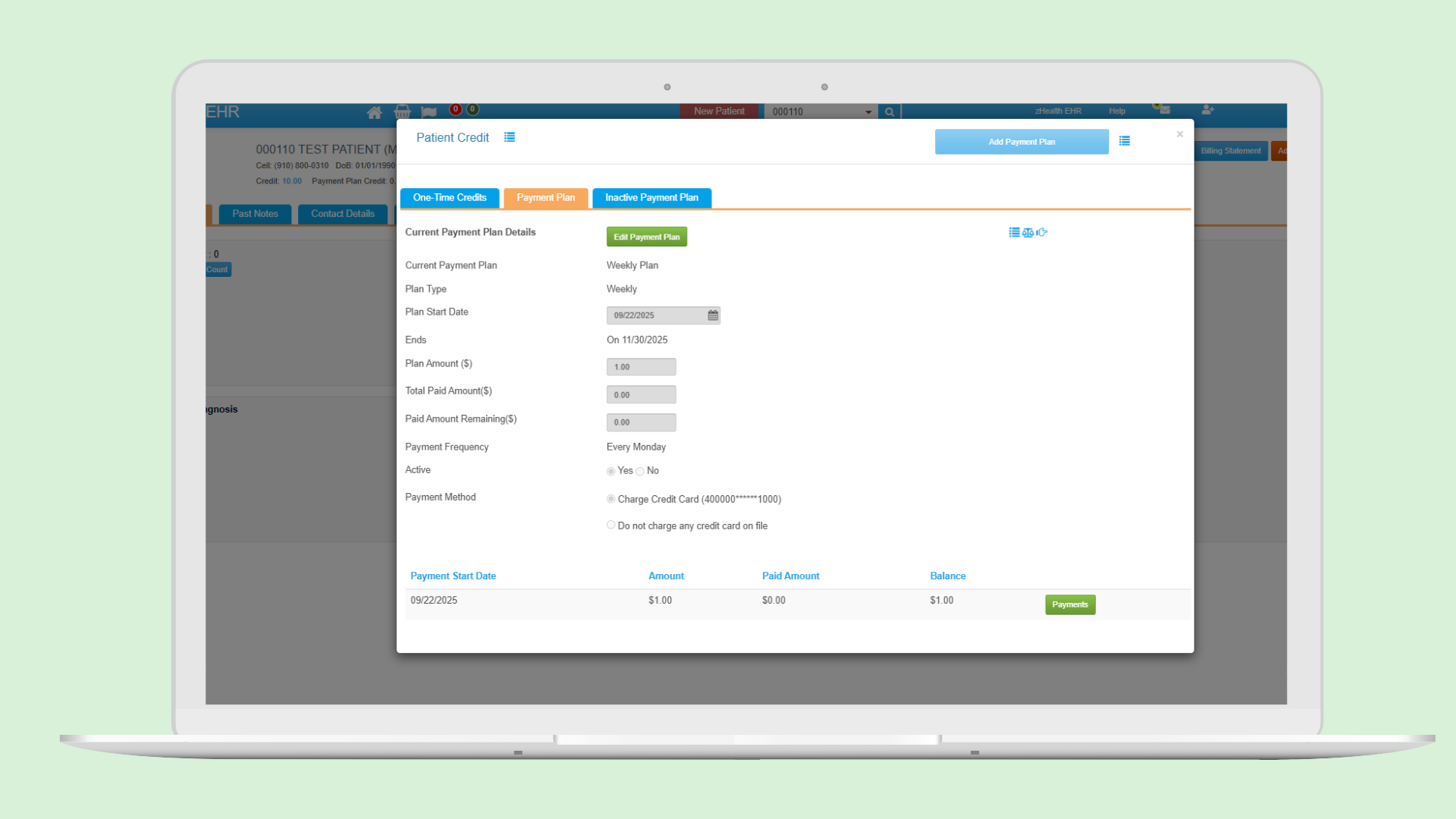 ![]() Note: A patient can have only one active Payment Plan at a time, and if you do not want to auto-charge the patient, then you can also select the "Do not charge any credit card on the file" option. |