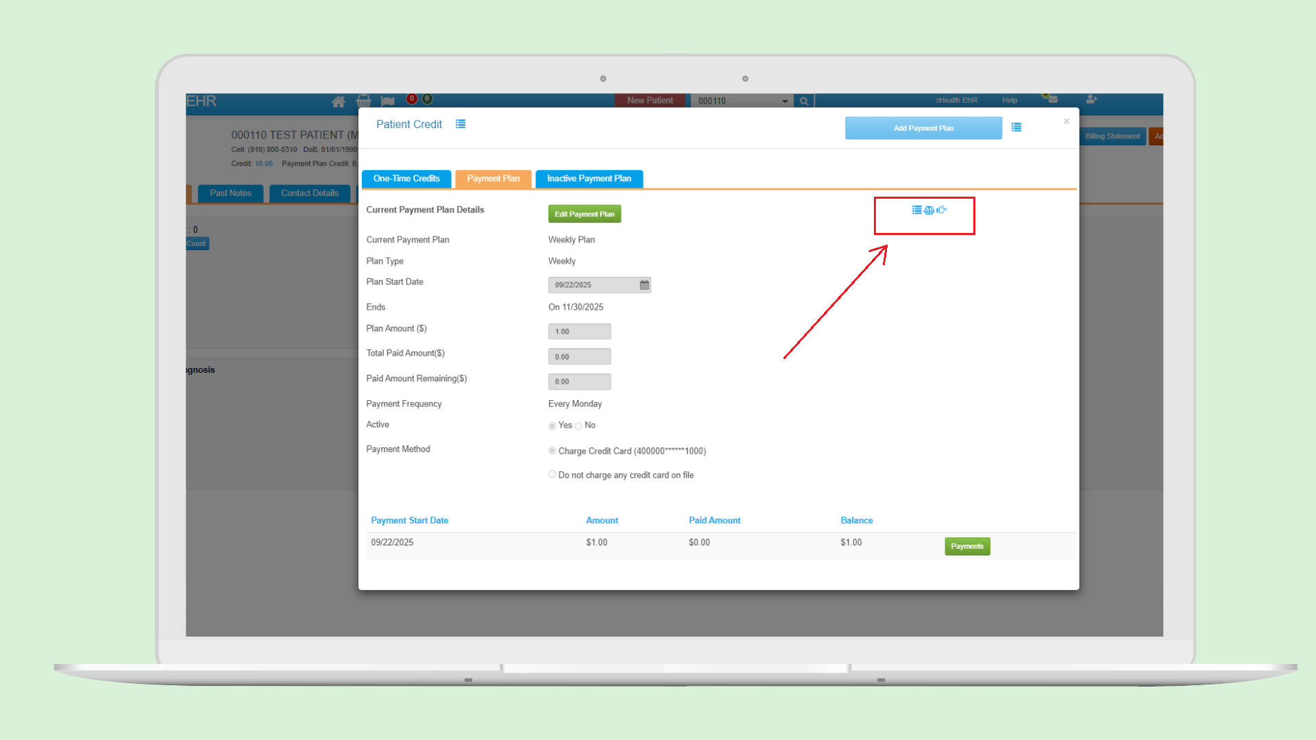 ![]() To batch apply the payment plan credit to multiple invoices, go to the Active Payment Plan tab and click the balance icon to batch appy the payment plan credit amount to the patient invoices |