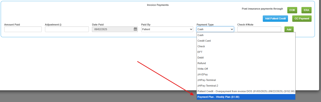 ![]() To apply a payment plan credit to an invoice, enter the desired amount (within the available balance), click the Payment Type field, and select the appropriate payment plan credit to apply it to the invoice. Typically, a Payment Plan is displayed in the following format: PAYMENT PLAN – [PLAN NAME (Available $Amount)]. |