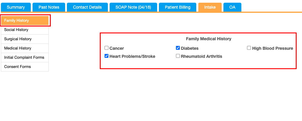 2. Under the Intake section, you will be able to view the first section - Family Medical History - by default. If the patient has submitted family history during intake, you can view the submitted information in this section.