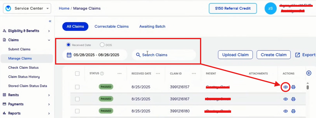 Search the claim By receive date or date of service or the claim number and then click the Eye sign as showed In below image -