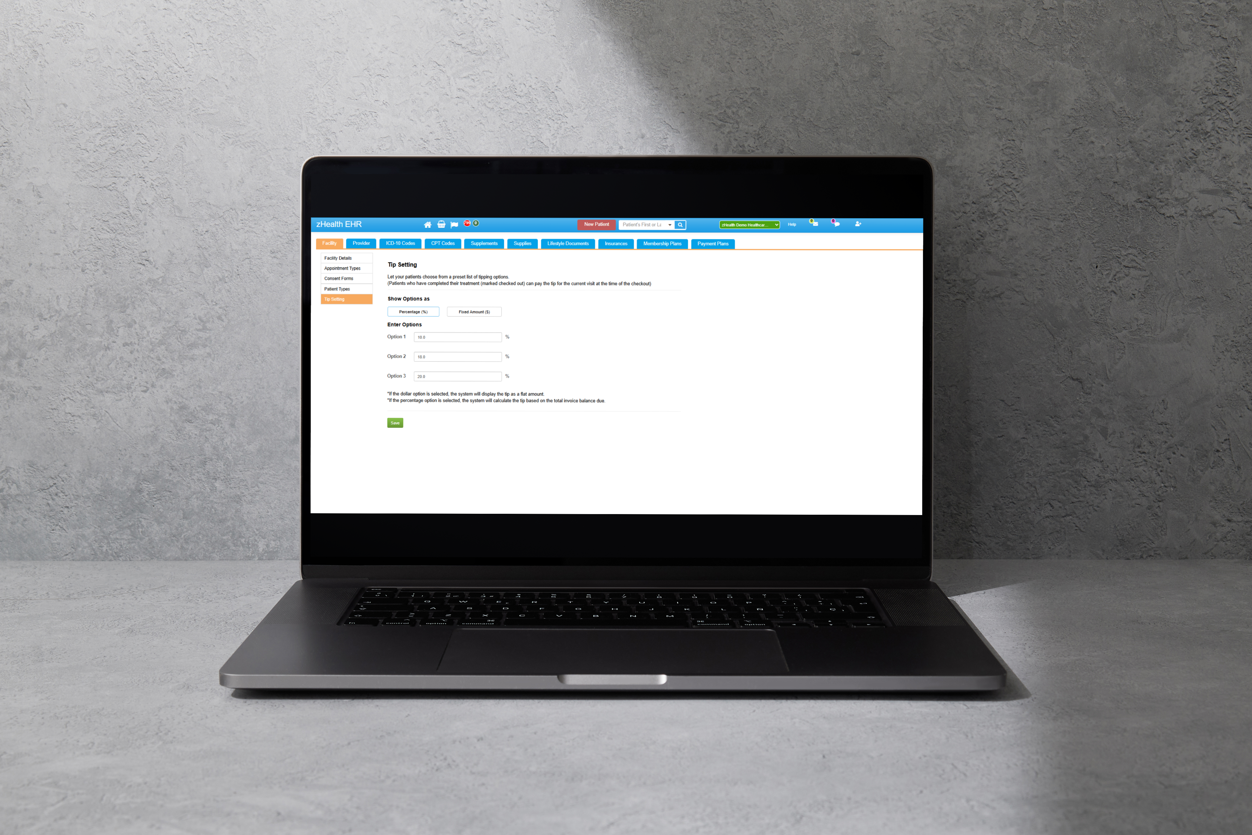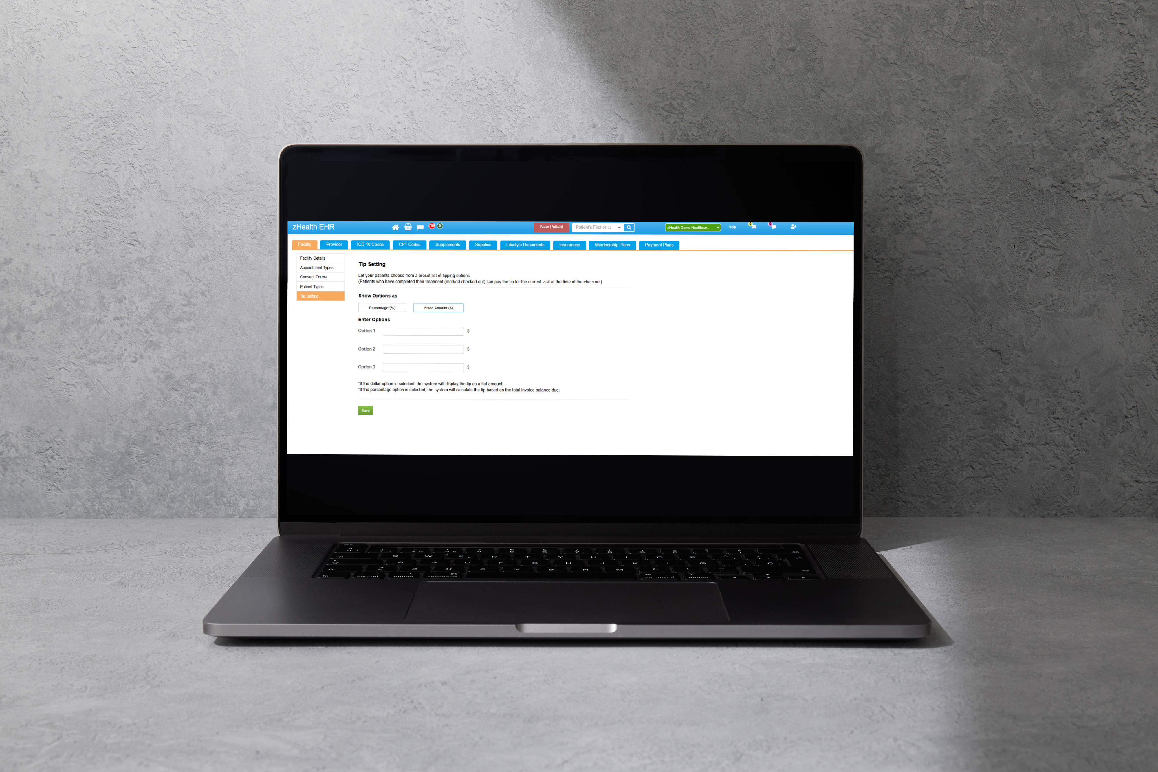 If you do not see the Tip Settings option in your system, it means the Tip Feature has not been enabled. Please contact zHealth Customer Support to activate it for your clinic.